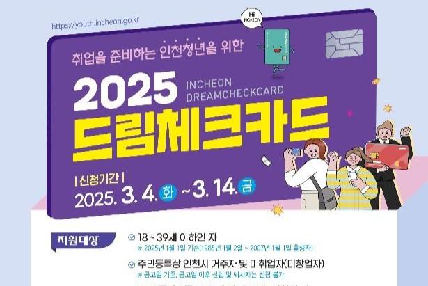 인천광역시(시장 유정복)는 미취업 청년의 구직활동을 지원하는 `2025년 드림체크카드 사업` 참여자를 오는 3월 14일까지 모집한다.