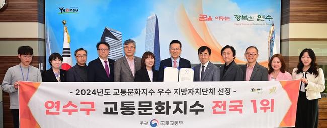 연수구(구청장 이재호)가 지난 23일 국토교통부 주관으로 한국교통안전공단이 실시한 `2024년 교통문화지수 평가` 결과 자치구 부문 전국 1위를 달성하며 국토교통부 장관상을 받았다.