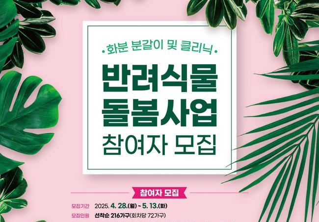 연수구(구청장 이재호)는 도시민의 정서적 안정과 녹색생활 실천을 위한 ` 반려 식물 돌봄사업` 참여자를 모집한다.
