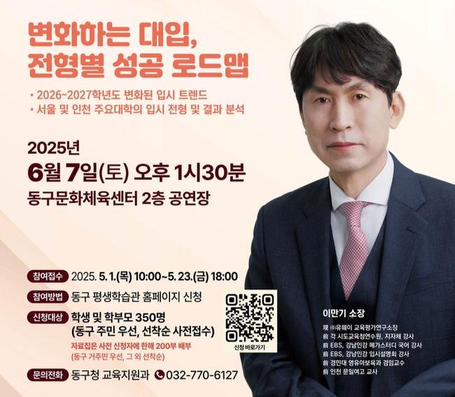 인천 동구(구청장 김찬진)는 오는 6월 7일 `2026학년도 변화하는 대입, 전형별 성공 로드맵`을 주제로 최고의 입시전문가인 이만기 유웨이교육평가연구소장을 초청해 대입설명회를 개최한다고 밝혔다.