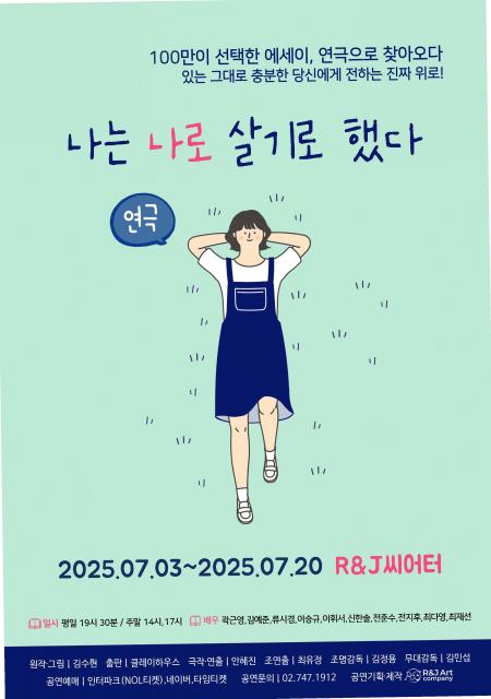 180만 독자의 마음을 사로잡은 김수현 작가의 베스트셀러 에세이 ‘나는 나로 살기로 했다’가 다시 한번 무대 위에서 관객들과 만난다. 연극 ‘나는 나로 살기로 했다’는 시즌3로 돌아오며, 7월 3일부터 20일까지 서울 대학로 R&J씨어터에서 관객들을 만날 예정이다.