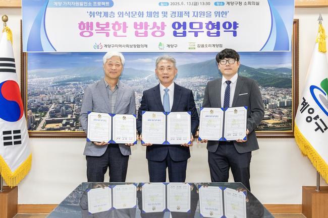 인천광역시 계양구(구청장 윤환)는 13일 계양구지역사회보장협의체(민간위원장 윤성묵), 감골오리 계양점(대표 정흥주)과 `행복한 밥상` 업무협약을 체결했다.