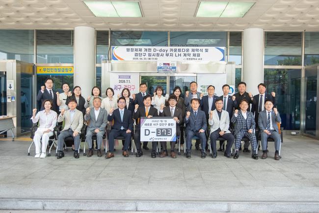 인천 서구(구청장 강범석)는 지난 23일(월) 서구청 본청 현관 앞에서 `행정체제 개편 D-day 카운트다운 제막식 및 검단구 임시청사 부지 사용 계약 체결식(LH)`을 가졌다고 24일 밝혔다.