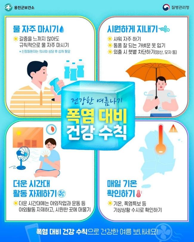 폭염 대비 건강수칙으로는 ▲규칙적인 물 섭취 및 스포츠음료 활용 ▲더운 시간(낮 12시∼오후 5시)대에는 활동 자제하기 ▲외출 시 자외선 차단제를 바르고, 챙이 넓은 모자, 부채 등 준비 ▲기상상황 수시 확인(TV, 인터넷, 라디오 등) ▲현기증·메스꺼움 등 이상 증상 발생 시 즉시 그늘에서 휴식 등이다.