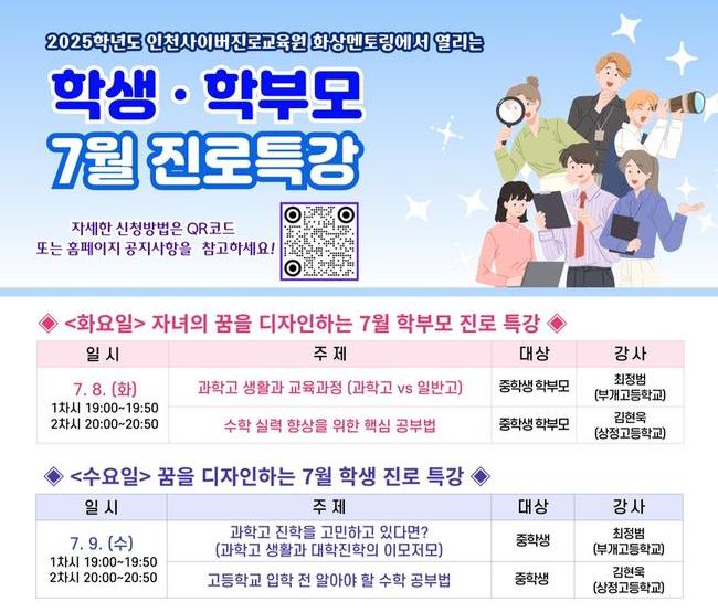 인천광역시교육청(교육감 도성훈)은 7월 8일부터 18일까지 중·고등학생과 학부모를 대상으로 `7월 진로특강`을 운영한다.