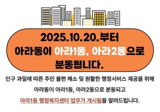 아라동은 개청 이후 지속적인 인구 증가로 2025년 9월 말 기준 인구수는 7만 3,728명에 이르렀으며, 인구 과밀화로 인한 행정·복지업무의 효율성 저하 우려가 꾸준히 제기됨에 따라 보다 효율적인 행정체계를 마련하기 위해 분동이 추진됐다.