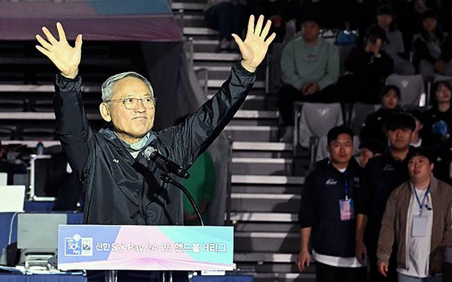 유인촌 문화체육관광부 장관이 10일 서울 송파구 올림픽핸드볼경기장에서 열린 2024-2025 핸드볼 H리그 개막식에서 축사를 하고 있다.