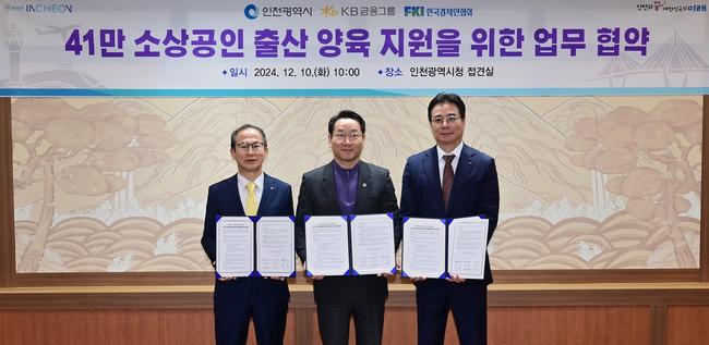 인천광역시(시장 유정복)는 12월 10일 인천시청 대접견실에서 KB금융그룹(회장 양종회), 한국경제인협회(회장 류진)와 함께 인천지역 소상공인의 출산·양육 지원을 위한 업무협약을 체결했다고 밝혔다.