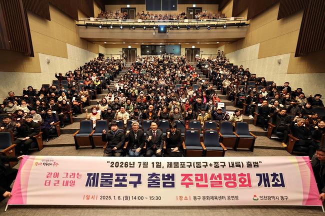 인천 동구(구청장 김찬진)는 지난 6일 동구문화체육센터에서 `제물포구 출범 주민설명회`를 성공적으로 개최했다고 밝혔다. 설명회에는 약 400여 명의 주민이 참석했다.
