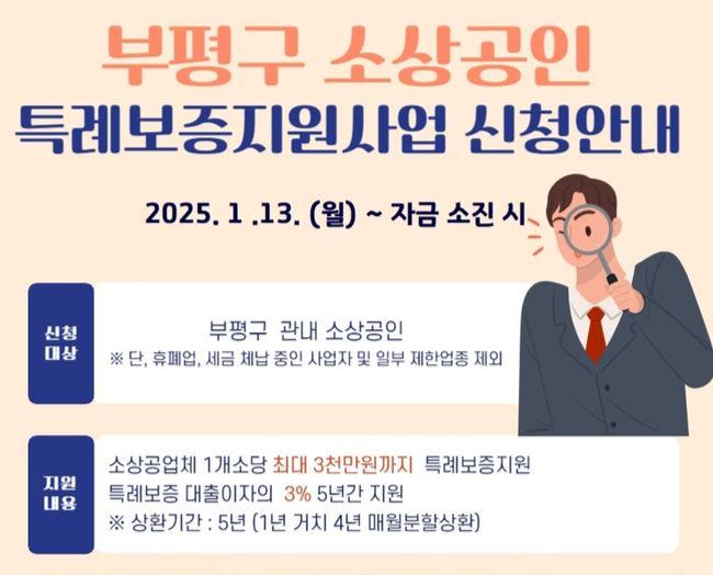부평구(구청장 차준택)는 경기침체로 어려움을 겪고 있는 소상공인을 돕기 위해 `2025년 소상공인 특례보증 사업`을 추진한다고 밝혔다.