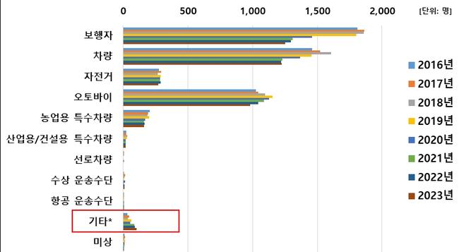 운수사고 비율은 전반적으로 감소했으나, 전동킥보드와 같은 개인형 이동장치 관련 사고는 2016년 34건에서 2023년 103건으로 약 3배 증가했다. 개인형 이동장치 사용 중 사고로 응급실을 찾은 환자의 75%가 헬멧을 착용하지 않은 것으로 나타나, 안전 장비 착용에 대한 인식 개선이 시급한 상황이다.