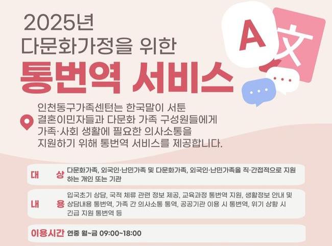 인천동구가족센터(센터장 박미희)는 결혼이민자의 언어적 어려움을 해소하고, 지역사회 안정적 정착을 지원하고자 통번역서비스 사업을 추진하고 있다고 밝혔다.