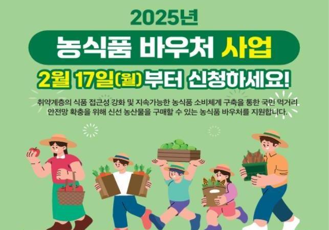 신청은 2월 17일부터 12월 12일까지 주소지 읍·면·동 행정복지센터를 방문하거나, 온라인 및 농식품바우처 고객센터(1511-0857)를 통해 수시로 가능하다.