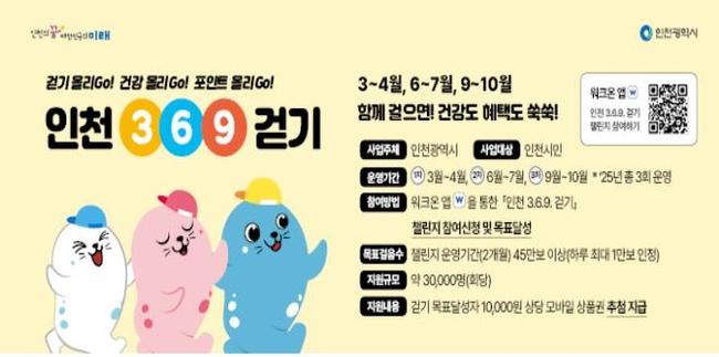 특히 `3.6.9 걷기 챌린지`는 시민들이 하루 7천보 이상 걷기를 목표로 설정해 실천할 수 있도록 돕는 프로그램으로, 걷기를 지속적으로 이어 나갈 수 있게 유도한다. 인천시가 처음으로 직접 시민을 대상으로 주도하는 사업으로, 모바일 애플리케이션 `워크온`을 활용해 목표 걸음 수를 달성한 시민에게 1만 원 상당의 모바일 문화상품권을 제공하는 방식으로 운영된다.