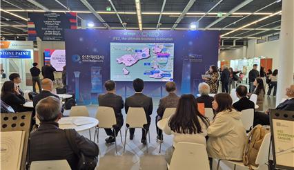 제 28차 세계한인경제인대회의 인천시 홍보부스에서 투자유치설명회가 진행되고 있다.
