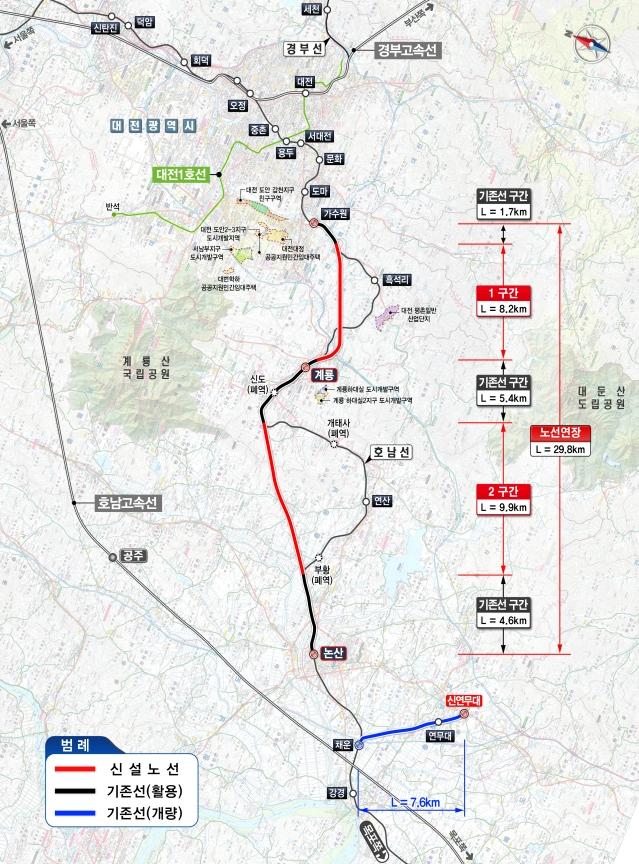 이번 기본계획은 일제 강점기에 건설된 호남선 가수원~논산 구간의 급곡선 선형을 바로잡고 노후 시설을 정비해 시속 250km 고속 주행이 가능한 선로로 개량하는 국책 사업이다. 총사업비 약 9200억 원이 투입되며, 신설 18.1km와 기존선 활용 11.7km로 구성된다. 정거장은 6곳으로, 훈련소 앞에 신연무대역 1곳을 신설하고 기존 5곳을 활용한다.